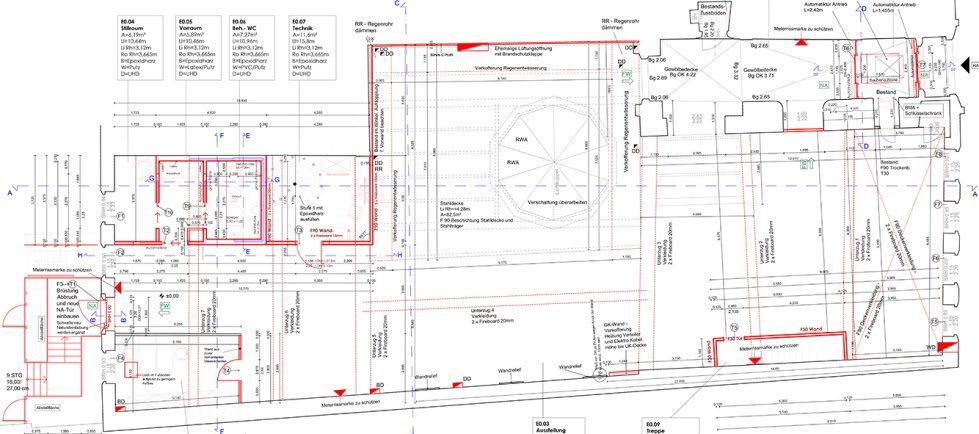 In Vorbereitung der Maßnahme waren daher umfangreiche Aufnahmen des Bestands nötig. Darüber hinaus wurde dem Bestand eine sensible Überarbeitung verordnet. Oberflächen mussten bereinigt, Einbauten entfernt und sanitäre Anlagen ergänzt werden. Der reduktive, sensible Ansatz führt Altenburg ein Objekt zu, welches für den wechselnden Ausstellungscharakter geeignet ist.