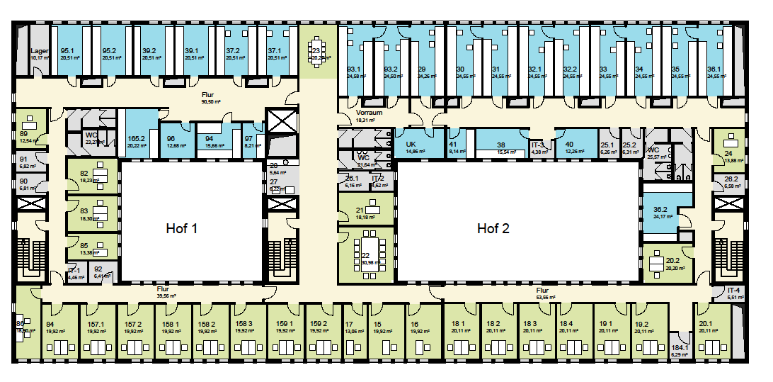 - Drei Hauptbereiche um zwei Lichthöfe