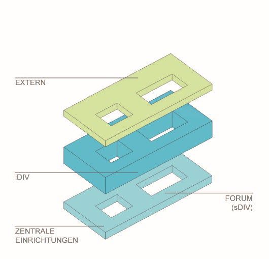 Das iDIV Leipzig wird als Forschungslabor die Biodiversitätsforschung unterstützen und an der Alten Messe den Forschungs- und Wissenschaftsstandort Leipzig verstärken. Das Haus arbeitet dazu als interdisziplinäre Kommunikationseinheit. Zentraler Bestandteil sind daher die disziplinübergreifenden Labor- und Arbeitsbereiche, die den wissenschaftlichen Austausch fördern sollen. Dazu wird im Erdgeschoss das Forum platziert, dass die allgemeinen und öffentlichen Funktionen übernimmt. Die Zwischenebenen sind dem Forschungsbereichen des iDIVs vorbehalten. Auf der obersten Ebene befinden sich die externen Bereiche der Arbeitsgruppen. Das Haus ist funktional für die Abläufe zwischen Büroarbeit, Laborforschung und Kommunikation optimiert.