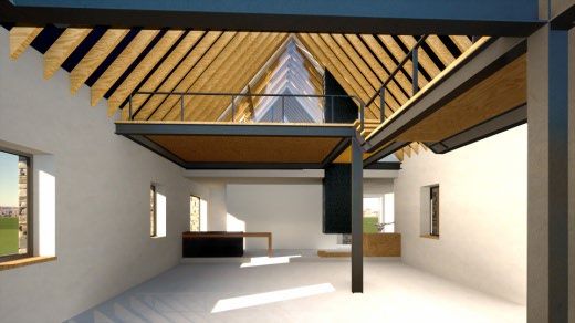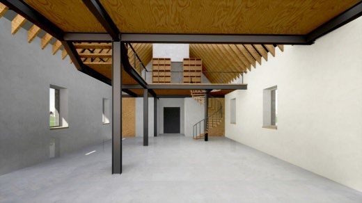 Die ehemalige Dorfkirche Treben wird einer neuen besonderen Nutzung zugeführt. Als Wohn- und Atelierraum dient der besondere Ort dem künstlerisch gelagerten Nutzer als Wohn und Lebensraum mit der Möglichkeit einen Ort der Begegnung zu schaffen. Um diesem Bedürfnis des Nutzers gerecht zu werden, wurde der Innenraum befreit und modern erneuert. Der Einschub von Emporen schafft in den Kopfbereichen des ehemaligen Kirchenbaus eine für die privateren Bereiche dienliche Intimität und ermöglicht gleichzeitig im mittleren Bau die Ausnutzung der vollen Höhe für den Begegnungsraum.